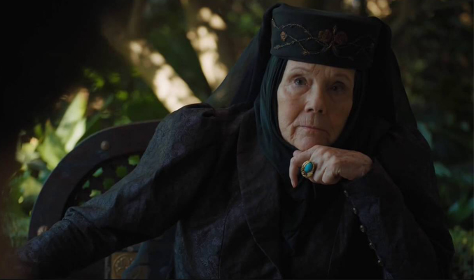 Con la caída de los Tryell de mala manera, la abuelísima no se queda con los brazos cruzados. Que placer es ver a una mandamás como Olenna (Diana Rigg) que intentará vengar la muerte de su hijo y sus nietos a toda costa y ahora tiene aliados suficientes para lograrlo. O al menos eso parece.