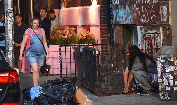 En un rincón junto a una papelera, un hombre se encuentra acuclillado, intentando defecar en la acera. Este es, por supuesto, un actor que forma parte del reparto, profesional que está actuando como el guión le exige. Sin embargo, la cara de absoluto horror de Dunham es tan real y convincente, que si no fuera por el equipo de cámaras y micros, cualquiera pensaría que es una situación verdadera, de las que solo se ven en los barrios "chungos" de Nueva York.