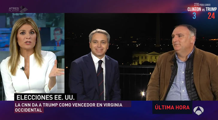 José Andrés, uno de los cocineros españoles más carismáticos, ha reaparecido en la madrugada de este miércoles en la televisión de nuestro país con motivo de las elecciones de EEUU, país en el que está afincado desde hace varios años. Ha sido en el especial emitido por Antena 3, donde ha acudido al set de Washington en el que se encuentra Vicente Vallés para dar su visión sobre cómo están viviendo los ciudadanos estadounidenses estos comicios.