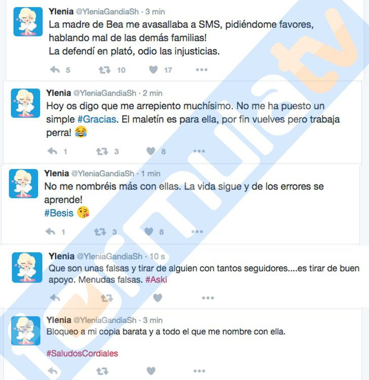 Parece ser que Ylenia es una persona tradicional y lo de publicar sus opiniones en Twitter y luego borrarlas se ha convertido en su seña de identidad. Tras meses defendiendo y apoyando a Beatriz, ahora ha decidido bloquearla en Twitter después de tener un fuerte enfrentamiento con su madre.