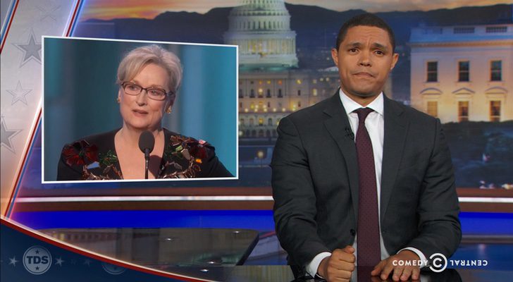 Sería tendencioso decir que a Trevor Noah no le gustó el apasionado discurso de Meryl Streep. En realidad, el presentador hizo un balance muy positivo de las palabras de la actriz. "La verdad es que si te quedas en esa parte del discurso pierdes lo más grande. Fue un discurso sobre el respeto, sobre la empatía. Y, lo que es más importante, fue un discurso sobre la responsabilidad", concluyó Noah.
