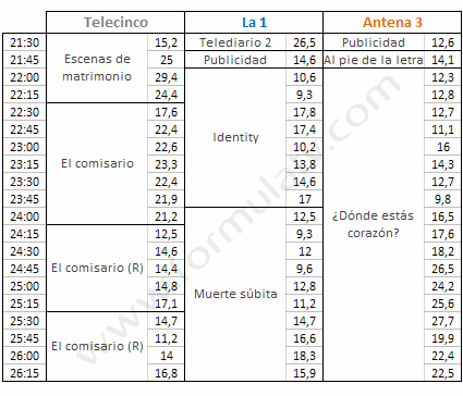 Telecinco lideró la franja del prime time con una media del 20,8%. 'Escenas de matrimonio' cayeron por debajo de los 4 millones (3.807.000), pero sedujeron al 23,9% de los espectadores. Baja medio punto. A continuación, el capítulo final de temporada de 'El comisario' titulado "Cadena de errores" marcó un 21,9% al sumar 3.455.000 personas. Sube 1,7 puntos. Sus posteriores reposiciones no pasaron del 14,4% (1.261.000) y del 13,9% (570.000). Malos registros aunque superan las medias del 12,9% y del 13,7% de hace una semana.