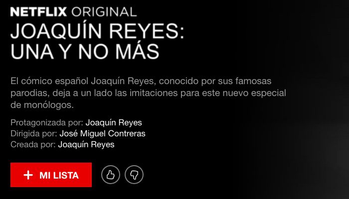 Con una amplia trayectoria en la pequeña pantalla, Joaquín Reyes ha participado en programas de gran notoriedad como 'Muchachada nui', 'Camera café' o 'La hora chanante'. También se dejó ver en la gran pantalla, en películas como "Spanish movie", y dejó su huella en el programa de radio "No somos nadie", de M80 Radio. El cómico llega a Netflix con el objetivo de cosechar el mismo éxito.