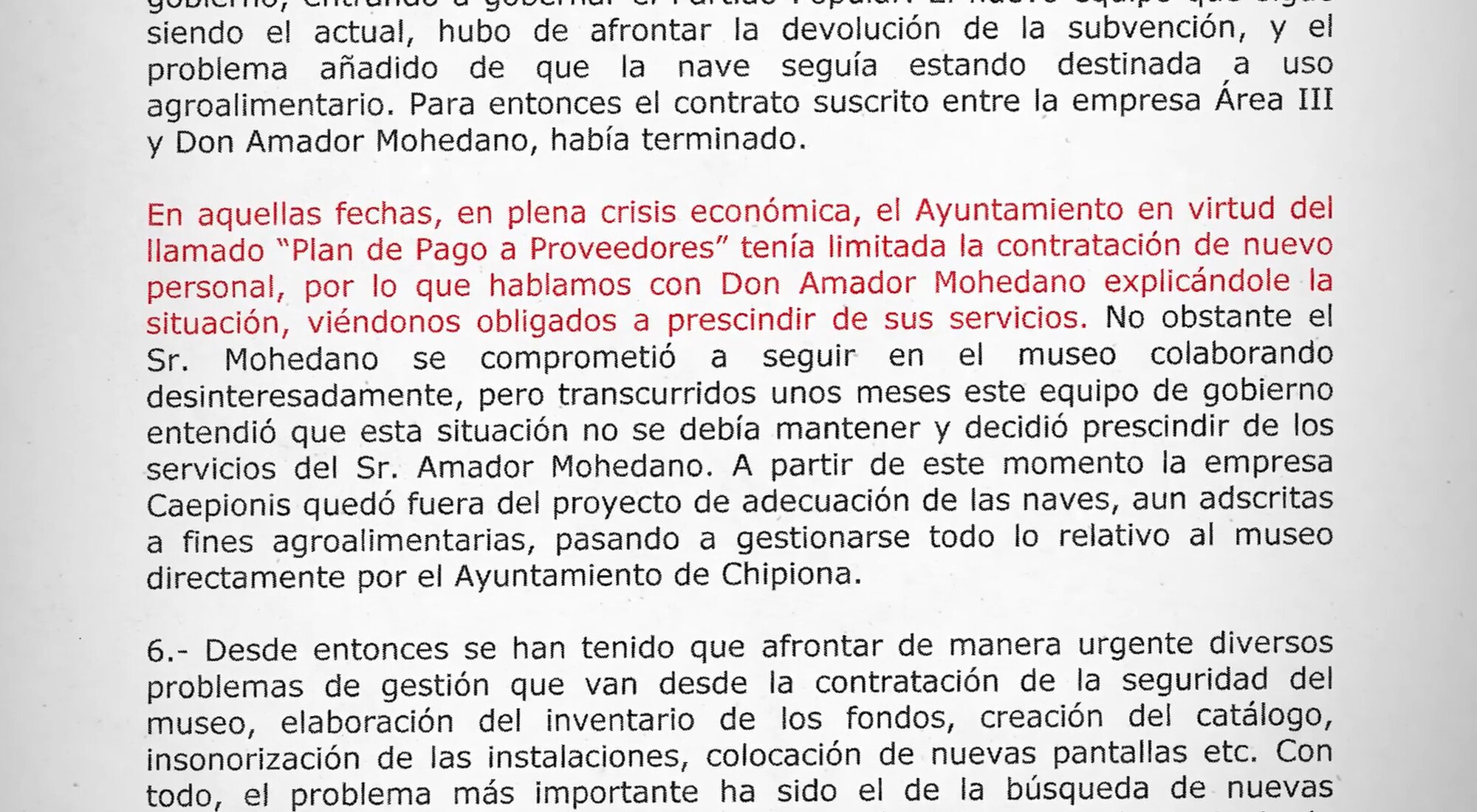 Las cosas llegaron hasta el punto de que, en 2015, el entonces alcalde Antonio Peña se puso en contacto con Rocío porque "me han llegado denuncias de la Policía Local de que Amador organiza fiestas en el museo a altas horas de la madrugada", información que incluso se desveló en 'Sálvame', donde la propia Rosa Benito lo confirmó. "Ante eso, yo no le puedo decir a Antonio Peña nada. Yo le digo: 'tú haz lo que consideres que debes hacer'. Y me dijo: 'Rocío, yo le voy a decir que no vuelva'. Por eso sale Amador del museo", explicó Carrasco. El Ayuntamiento trasladó la decisión en un comunicado publicado el 7 de julio de 2015, en el que incluso se prescindía de la colaboración gratuita del gaditano, aunque sin exponer lo que realmente había propiciado su marcha.