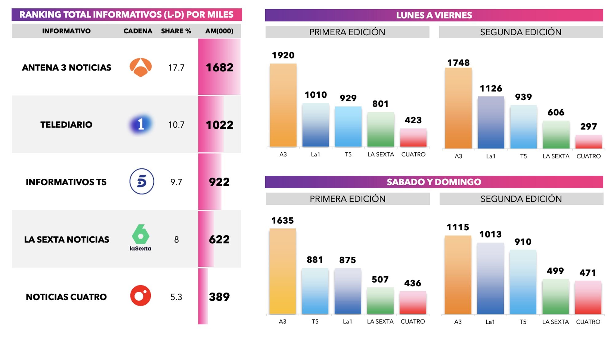 En la edición nocturna entre semana, el orden se repite con 'Antena 3 noticias 2' en lo más alto con una media del 16,8% y 1.748.000 espectadores. En este caso, 'Telediario 2' cuenta con 1.126.000 espectadores y un 10,9%. mientras que 'Informativos Telecinco 21:00' reúne a 939.000 y anota un 9%.