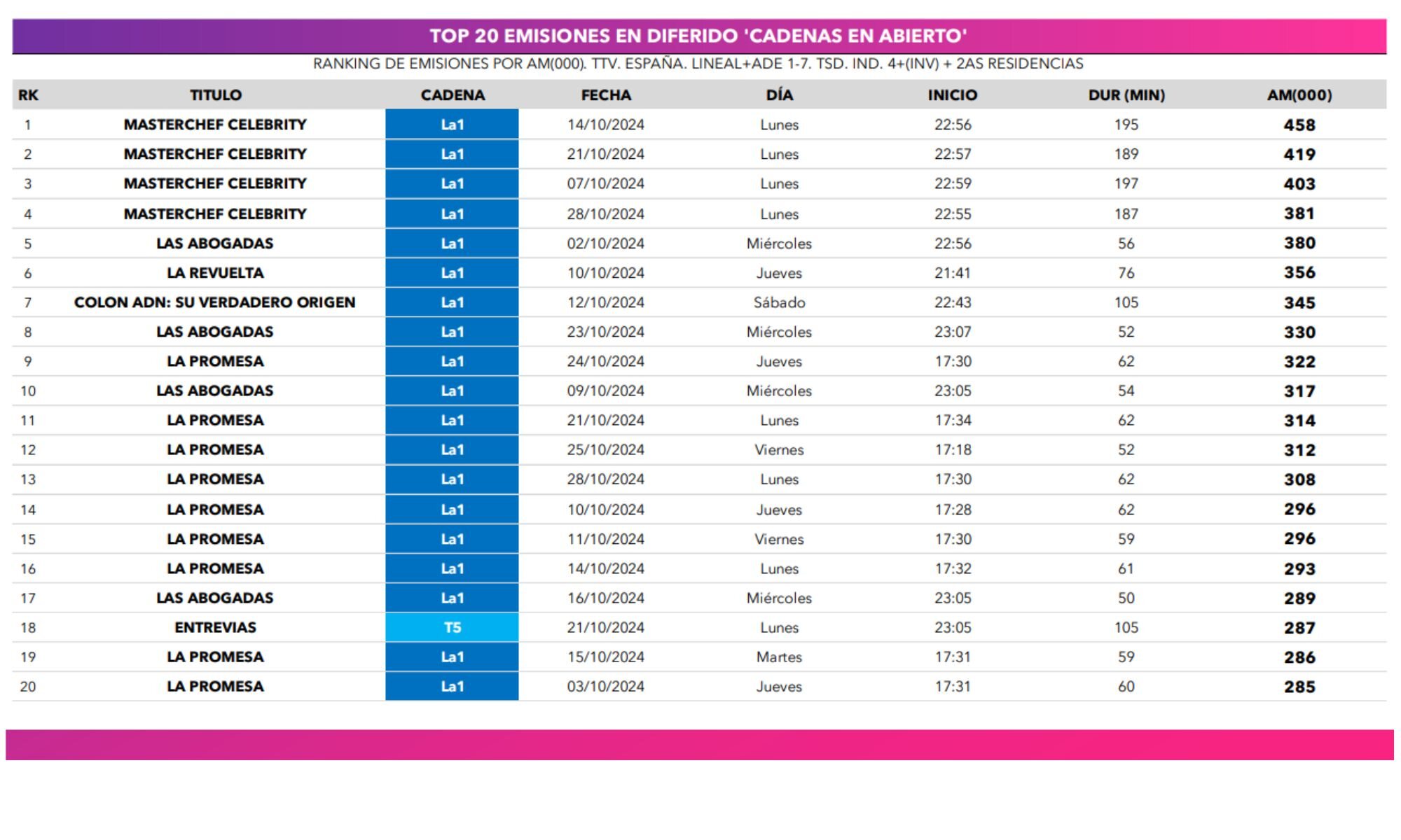 De hecho, el programa que vuelve a encabezar la lista es 'MasterChef Celebrity, con las cuatro emisiones del mes de octubre siendo lo más visto en diferido. Siguiendo con el ente público, la ficción 'Las abogadas completa el top 5 con el capítulo del 2 de octubre de 2024, teniendo también el resto de episodios del mes en la lista. 'La revuelta' del 10 de octubre de 2024 también se cuela en la lista, con la visita de Berto Romero y Andreu Buenafuente.