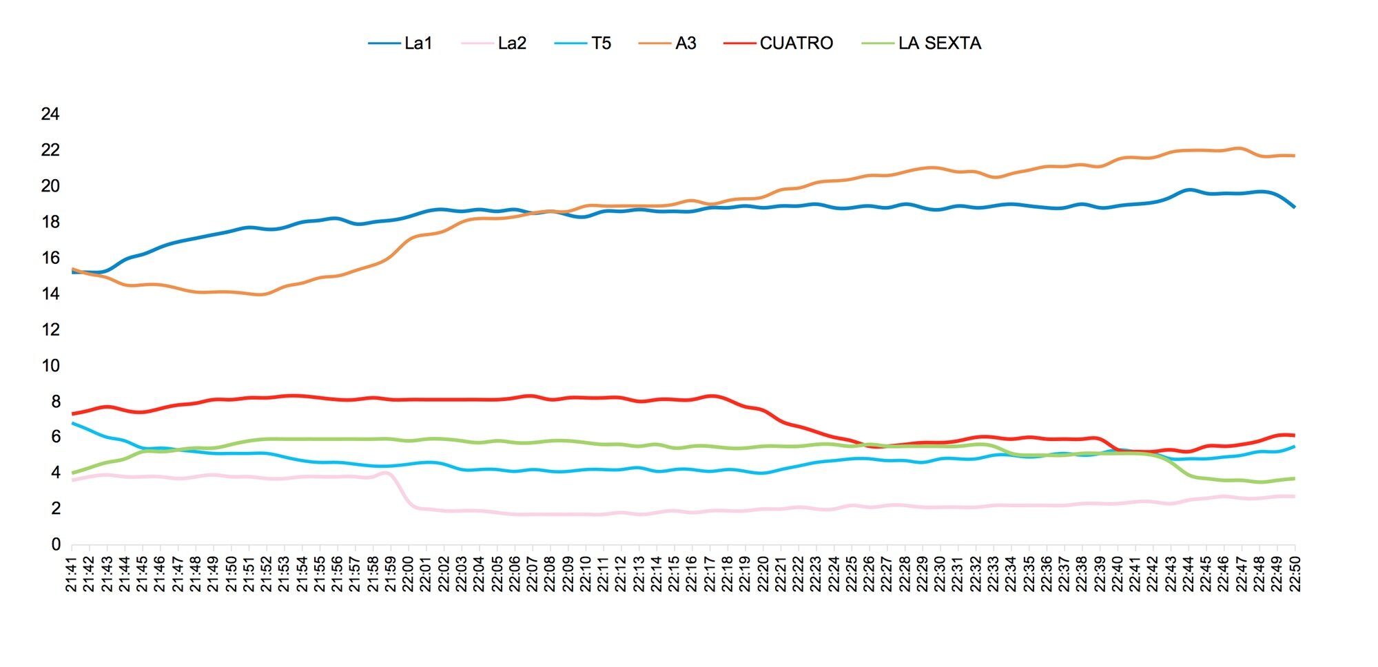 Pese a los enormes datos que está haciendo este nuevo programa, no está sirviendo como arrastre para el siguiente espacio. Si observamos las curvas, nada más finaliza 'La revuelta', la audiencia de La 1 cae en picado. De hecho, superando los dos millones de espectadores cada entrega, ninguna emisión posterior ha alcanzado el millón.