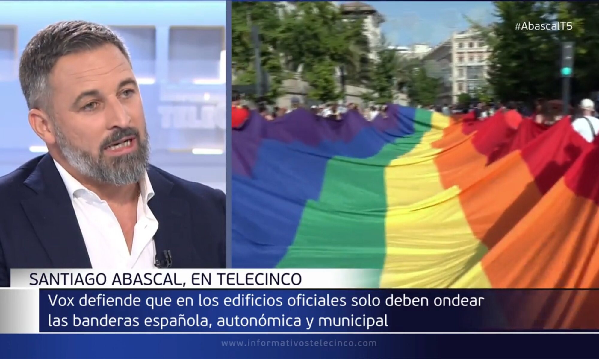 Abascal no dudó ni un momento en dar una respuesta más que preparada: "Para nosotros es muy claro. En primer lugar, es una bandera ideológica que no representa a todos los homosexuales. Hay muchos homosexuales que votan a Vox u otros partidos que no se sienten identificados con una bandera concreta. Es más, yo a los homosexuales que conozco la bandera que le representa es la de España, que nos integra y nos acoge a todos". Pero aquí no iba a quedar la cosa, y menos aún teniendo la oportunidad de atacar al gobierno.
