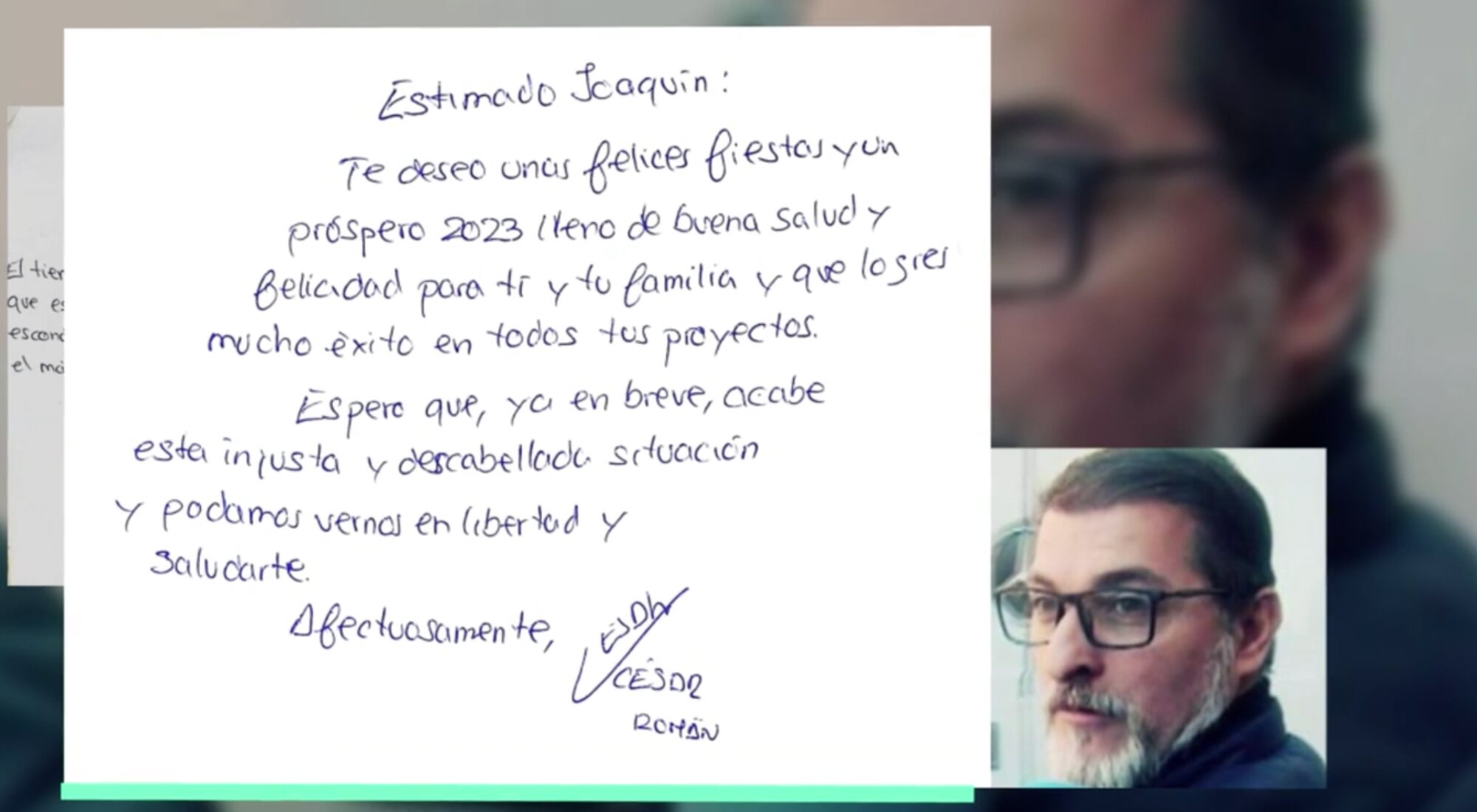 "Estimado Joaquín: Te deseo unas felices fiestas y un próspero 2023 lleno de buena salud y felicidad para ti y tu familia y que logres mucho éxito en todos tus proyectos. Espero que, ya en breve, acabe esta injusta y descabellada situación y podamos vernos en libertad y saludarte", escribe el preso, antes de despedirse "afectuosamente" de Prat. A pesar de que algunos colaboradores, y la propia Ana Rosa Quintana, trataron de quitarle hierro al asunto, Joaquín Prat se mantuvo con gesto muy serio.
