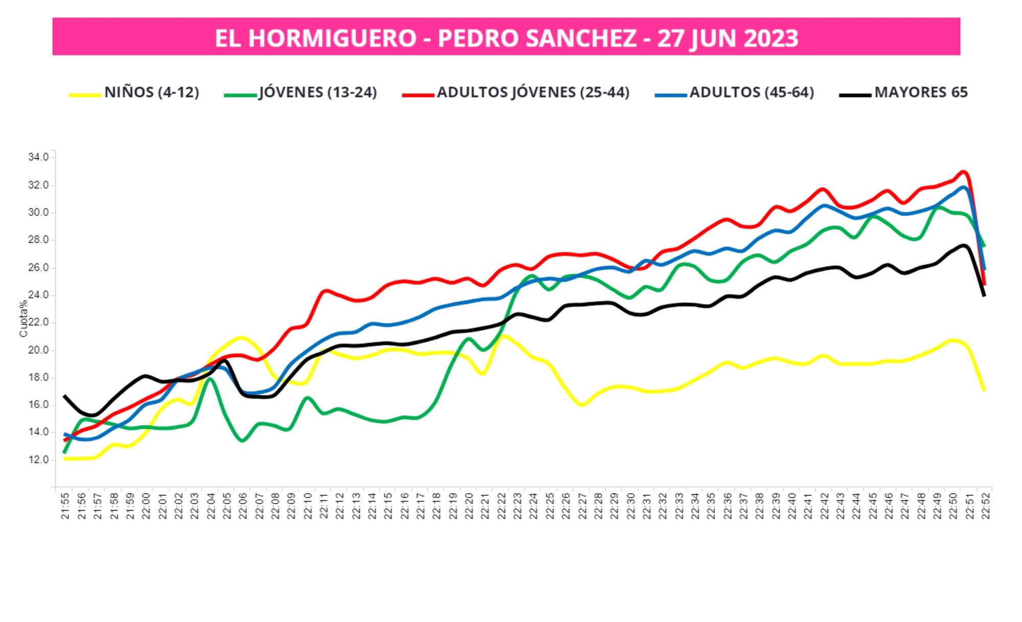 Si miramos los datos por edades sí que vemos algún que otro cambio a destacar. Como hemos visto en la tabla general, el grupo por edades que más vio a Sánchez es el de 25 a 44 años. Sin embargo, esa franja se queda tercera para Feijóo, cuyas edades que más lo siguieron son las comprendidas entre los 13 y 24 años, seguida de los de 45 a 64 años.