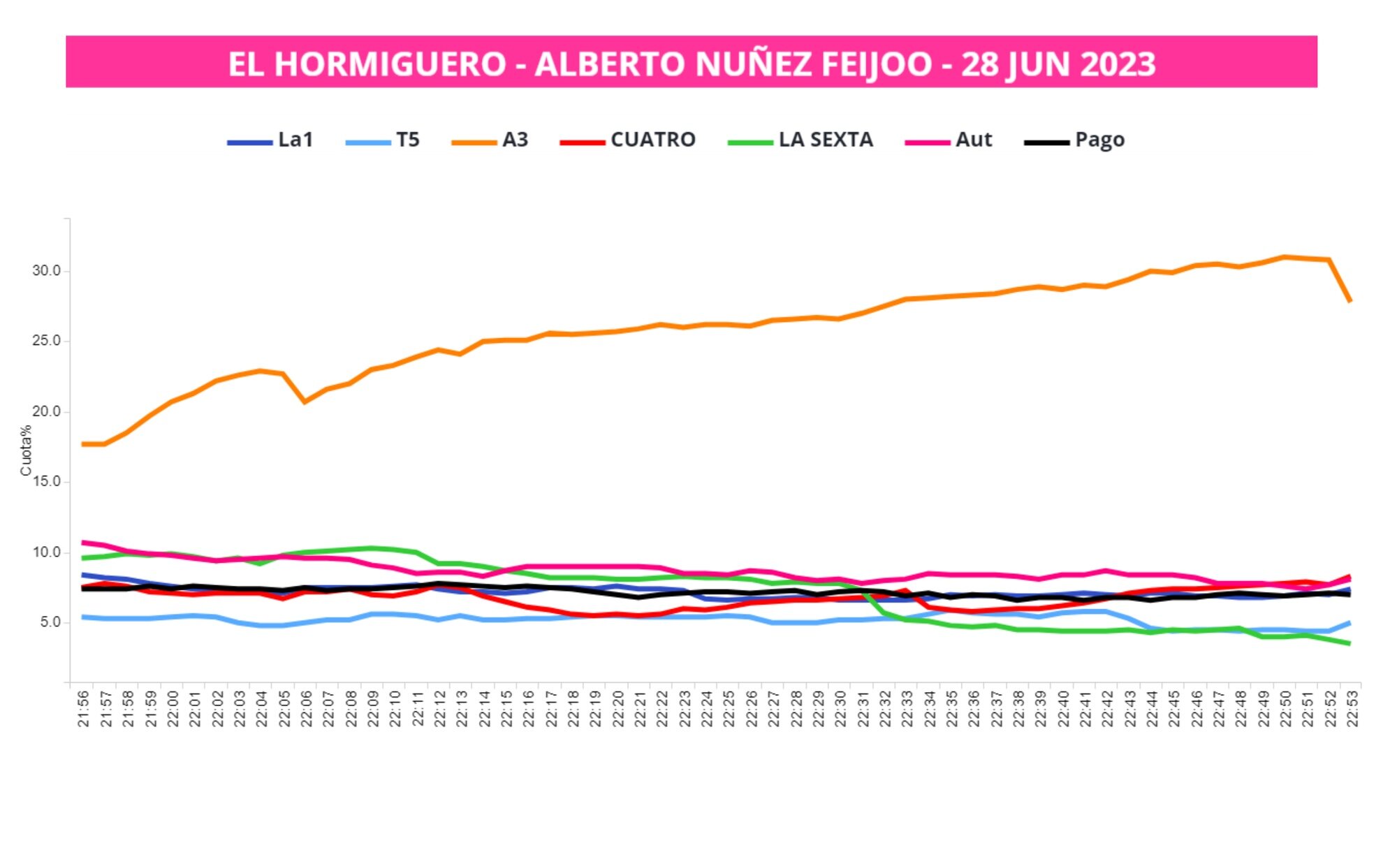 Sus datos de audiencia han sido espectaculares. El programa con el actual Presidente del Gobierno reunió a 2.922.000 espectadores firmando un 22,8% de cuota de pantalla con su entrega comprendida entre las 21:54h. y las 22:52h. Por su parte, la visita del líder del PP sumó más público al contar con 3.079.000 espectadores y un 25,9% de share.
