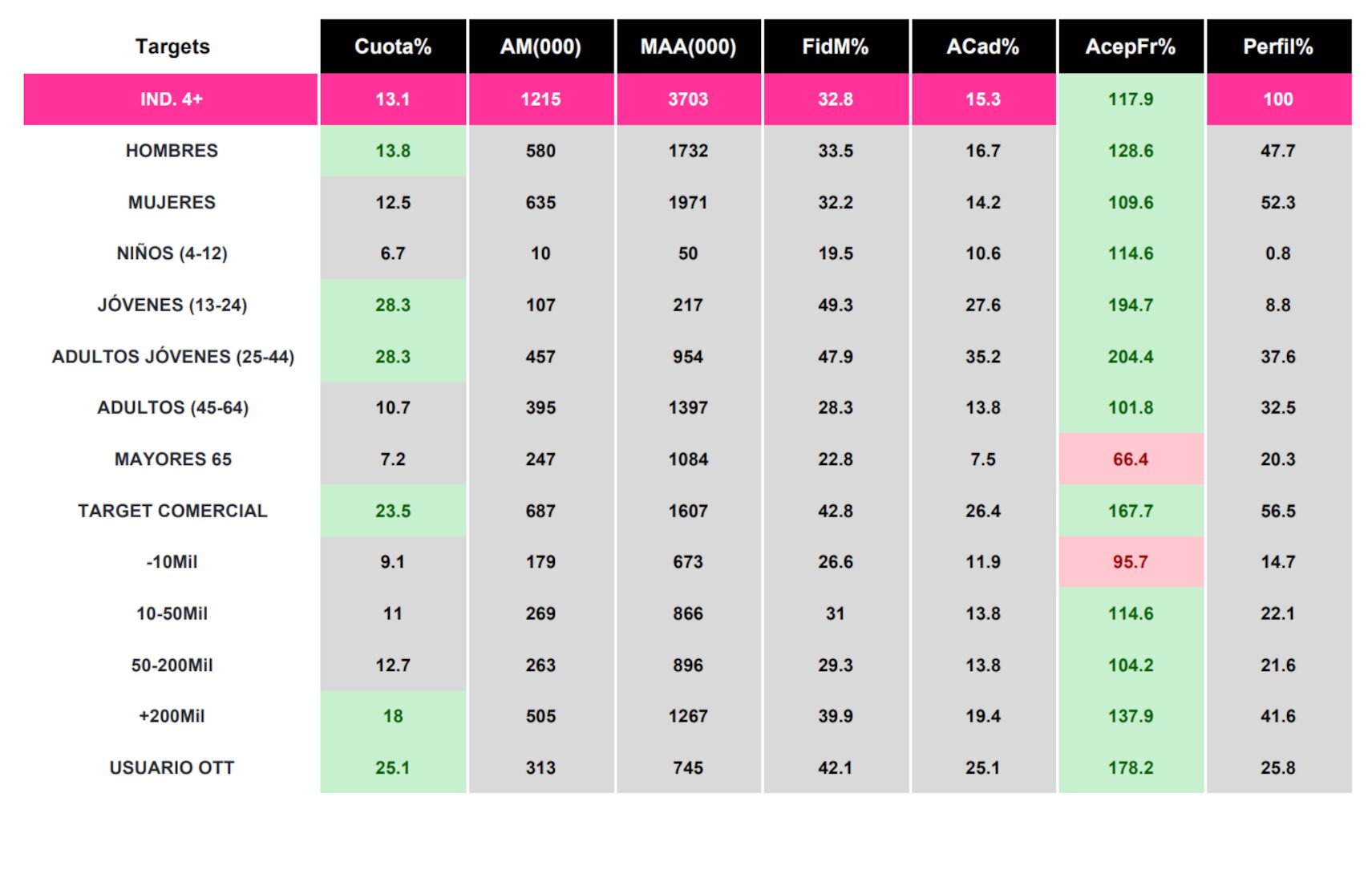 A lo largo de sus 110 minutos, la gala captó principalmente la atención del público masculino, con un 13,8%, mientras que entre mujeres cosechó un 12,5%, como refleja el informe elaborado por Dos30'. En lo que respecta a las franjas de edad, sus grandes bastiones son una vez más los que atañen a jóvenes de entre 13 y 24 años y a adultos jóvenes de entre 25 y 44 años, ya que en ambos segmentos promedia un impresionante 28,3%. En cambio, los niños de 4 a 12 años (6,7%) y los mayores de 65 años (7,2%) no muestran tanto interés, mientras que los adultos de 45 a 64 años anotan un 10,7%. A su vez, triunfa sobre todo en poblaciones de más de 200.000 habitantes (18%) y arrolla en el target comercial (23,5%) y entre los usuarios de OTT (25,1%).