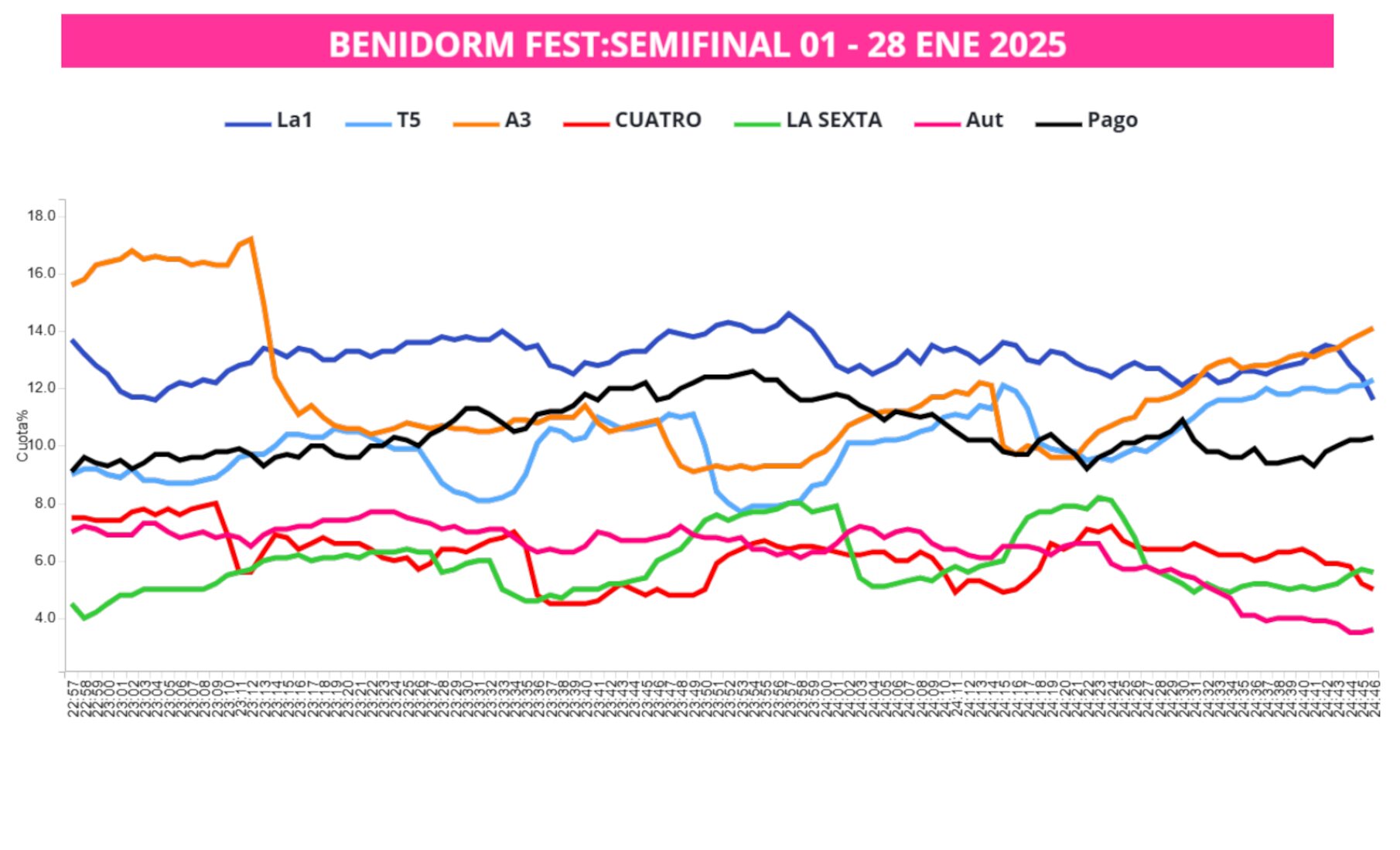 Desde ese momento se aprecia una estabilidad clara a lo largo de las actuaciones, aunque a las 23:38 se produce un descenso que permite que las temáticas de pago se acerquen peligrosamente, aunque no tarda en remontar progresivamente y alcanzar su máximo pico de audiencia sobre las 23:56, cuando se produce la actuación de Daniela Blasco. De ahí en adelante, hay una gran caída y, tras varios altibajos y un sorpasso de Antena 3, La 1 lidera momentáneamente mientras se anuncian los finalistas, para después caer de nuevo hasta el final de la emisión.