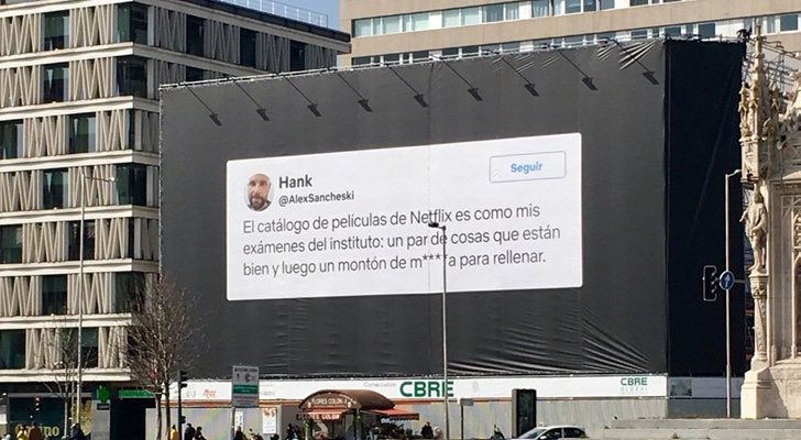 La plataforma de contenidos audiovisuales vía streaming siempre arriesga a la hora de promocionar sus propias series, pero especialmente lleva un tiempo haciéndolo en lonas publicitarias frente a la Plaza de Colón, en Madrid. En esta ocasión, Netflix ha usado para su estrategia de marketing y publicidad un sorprendente tuit de un usuario que no ve demasiada calidad en sus propuestas cinematográficas.