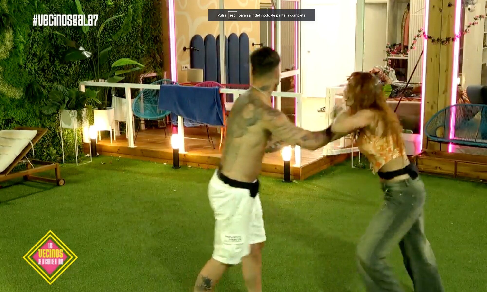 En un inicio, ambos protagonistas comenzaron a mancharse con nata el uno al otro entre risas. Sin embargo, cuando el italiano utilizó un huevo para machar la cabeza de su compañera, todo estalló por los aires. "Como hay líneas rojas que no vamos a permitir que se traspasen, ninguno de los dos forman parte de 'Los vecinos de la casa de al lado'", entonaba la presentadora desde el plató justo después de mostrar las imágenes de lo sucedido a los espectadores.