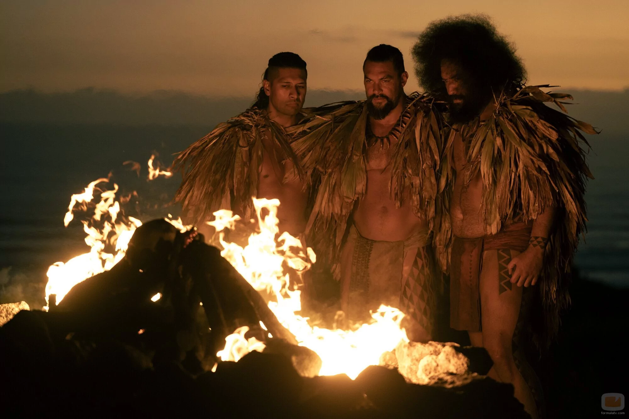 Te Kohe Tuhaka, Jason Momoa y Siua Ikale'o aparecen en una imagen del capítulo 'El gran guerrero' de la serie 'El gran guerrero'.