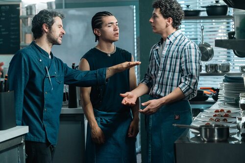 Lucas Miramón, Daniel Triana y Diego Martín aparecen en una escena promocional del capítulo 'Arroz mar y montaña con sepia, secreto ibérico y piparras' de 'Sin gluten'.