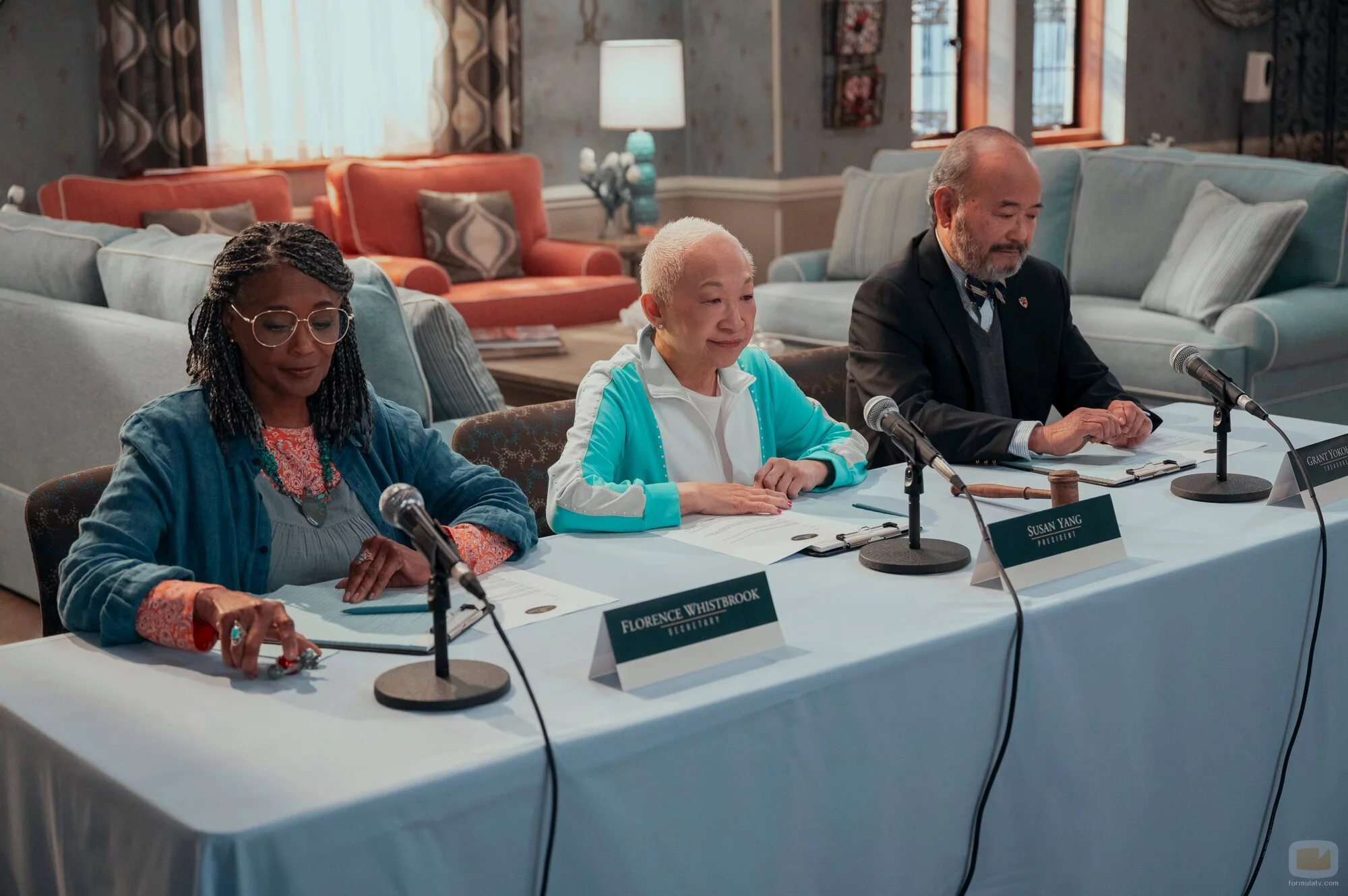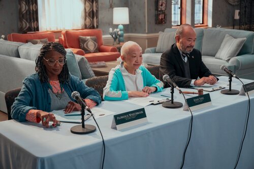 Clyde Kusatsu, Lori Tan Chinn y Margaret Avery aparecen en una foto del episodio 'Emily siempre llama dos veces' de la serie 'A Man on the Inside'.