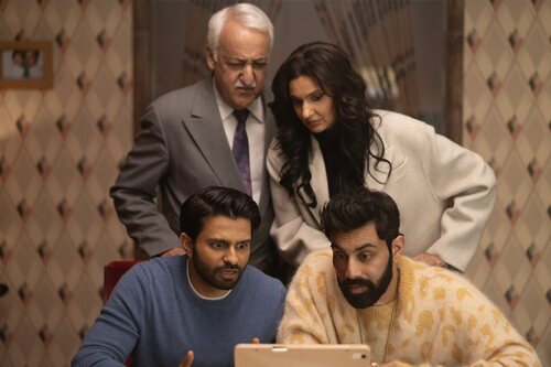 Poorna Jagannathan, Brian George, Saagar Shaikh y Asif Ali aparecen en una escena del capítulo 'Chicos sudorosos' de la serie 'Deli Boys'.