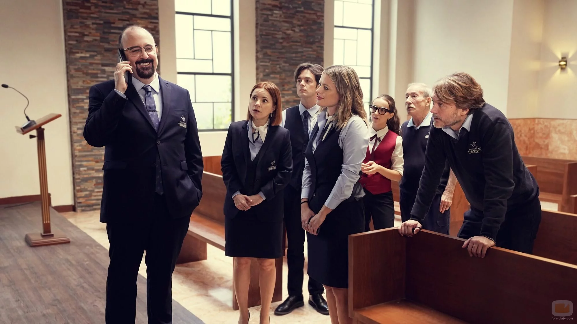 Aitziber Garmendia, Manolo Cal, Gerald B. Fillmore, Salva Reina, Lorea Intxausti Oregi, Adriana Torrebejano y Carlos Areces aparecen en una escena promocional del episodio 'Episodio 8' de la serie 'Muertos S.L.'.