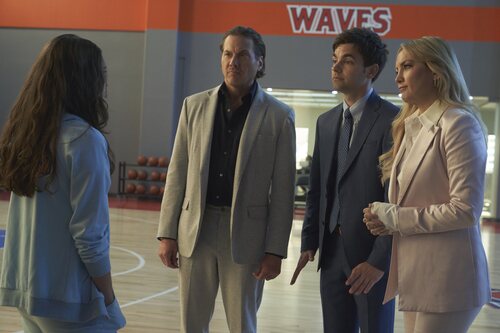 Scott MacArthur, Kate Hudson y Drew Tarver aparecen en una imagen promocional del episodio 1x10 de la serie 'Running Point'.