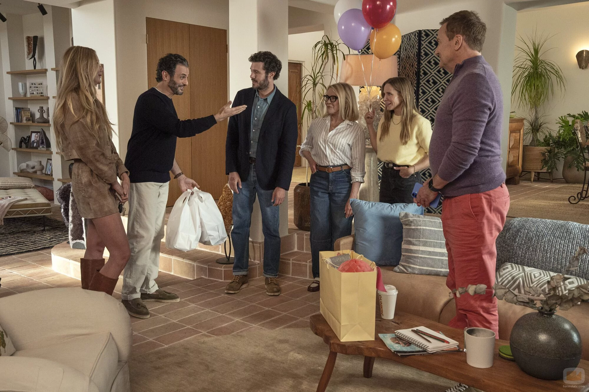 Arian Moayed, Michael Hitchcock, Adam Brody, Stephanie Faracy, Justine Lupe y Kristen Bell aparecen en una foto del episodio 2x03 de 'Nadie quiere esto'.