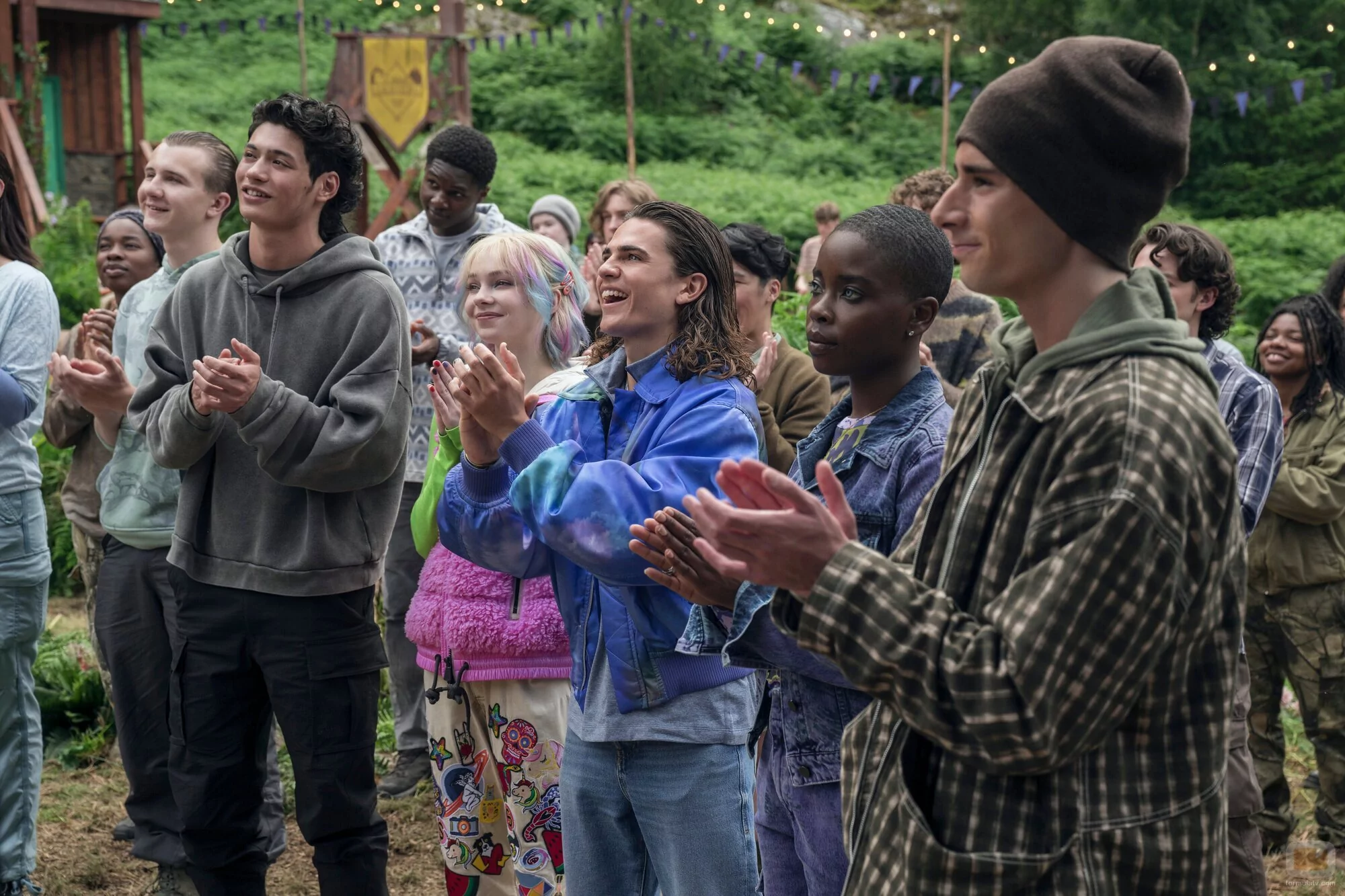 Georgie Farmer, Emma Myers y Joy Sunday aparecen en una imagen del episodio 2x03 de la serie 'Wednesday', la serie de televisión de Netflix.
