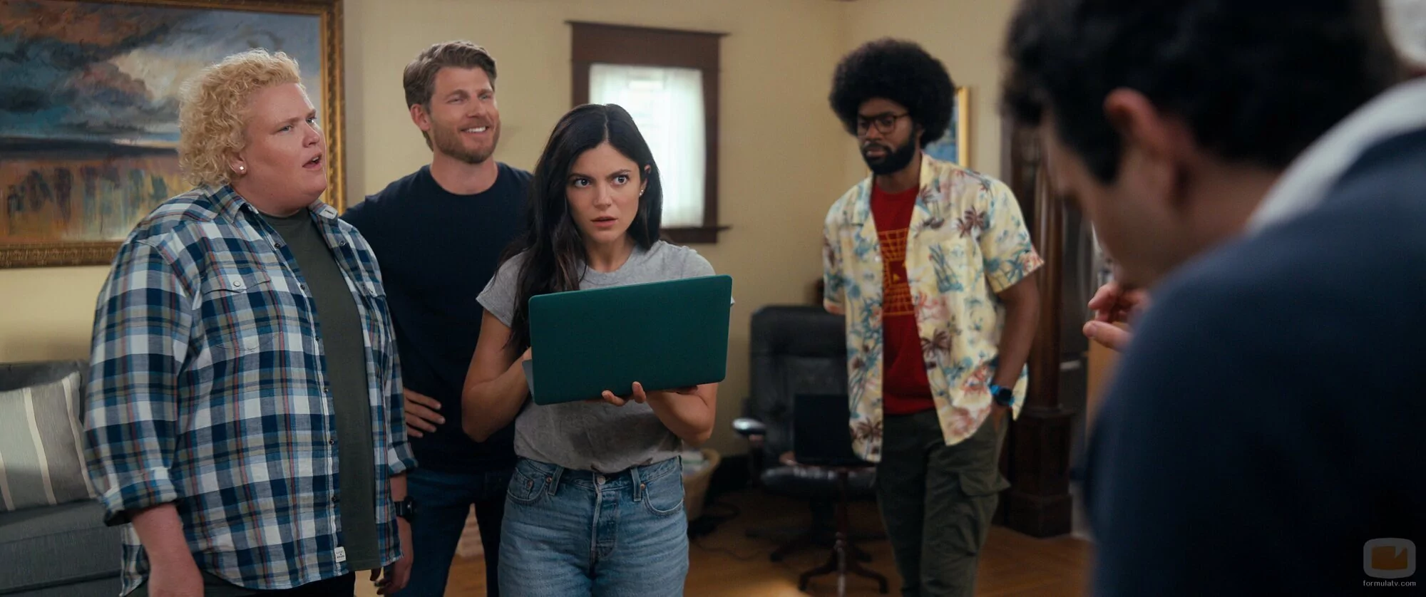 Milan Carter, Monica Barbaro, Travis Van Winkle y Fortune Feimster aparecen en una foto del episodio 2x04 de 'FUBAR'.
