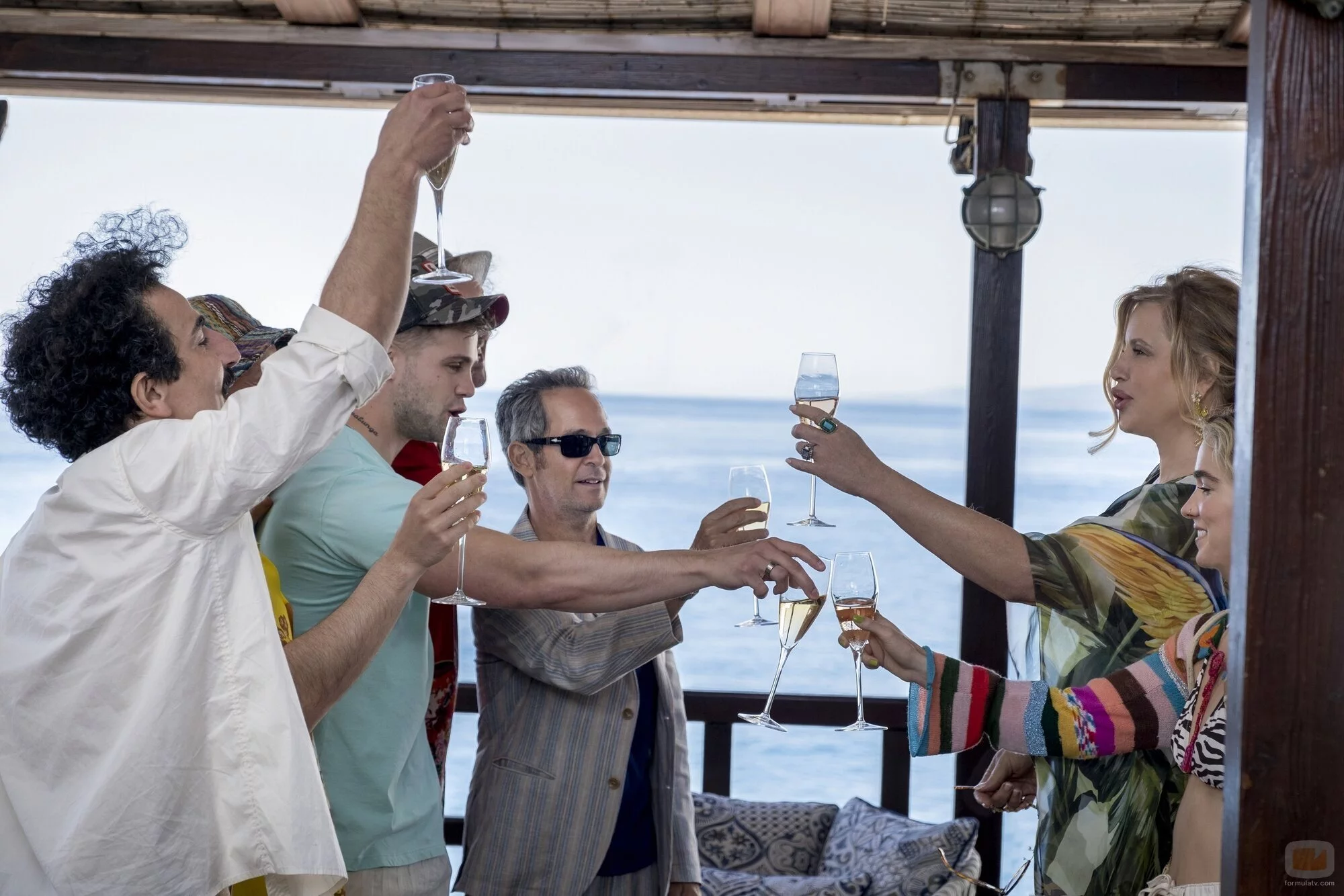 Jennifer Coolidge, Haley Lu Richardson, Leo Woodall y Tom Hollander aparecen en una foto promocional del episodio 2x04 de la serie 'The White Lotus'.