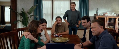 Monica Barbaro, Arnold Schwarzenegger, Jay Baruchel, Travis Van Winkle, Andy Buckley y Fabiana Udenio aparecen en una foto promocional del episodio 'Un viaje por el abismo' de 'FUBAR'.