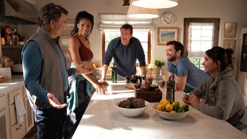 Jason Segel, Michael Urie, Christa Miller, Ted McGinley y Jessica Williams aparecen en una escena del episodio 'Tirarse al mar' de 'Terapia sin filtro'.