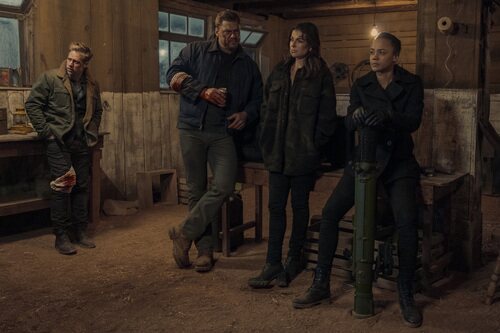 Alan Ritchson, Serinda Swan, Shaun Sipos y Maria Sten aparecen en una escena promocional del capítulo 'Un tipo de altos vuelos' de 'Reacher'.