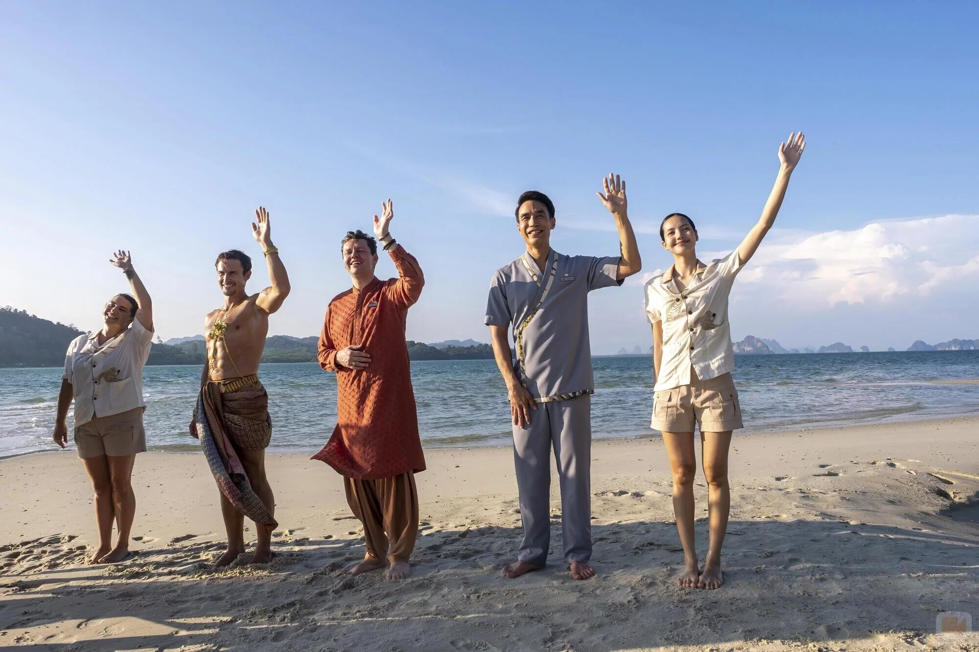 Arnas Fedaravicius, Christian Friedel, Dom Hetrakul, Lalisa Manoban y Morgana O'Reilly aparecen en una foto del episodio 'Same Spirits, New Forms' de la serie 'The White Lotus'.