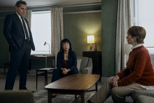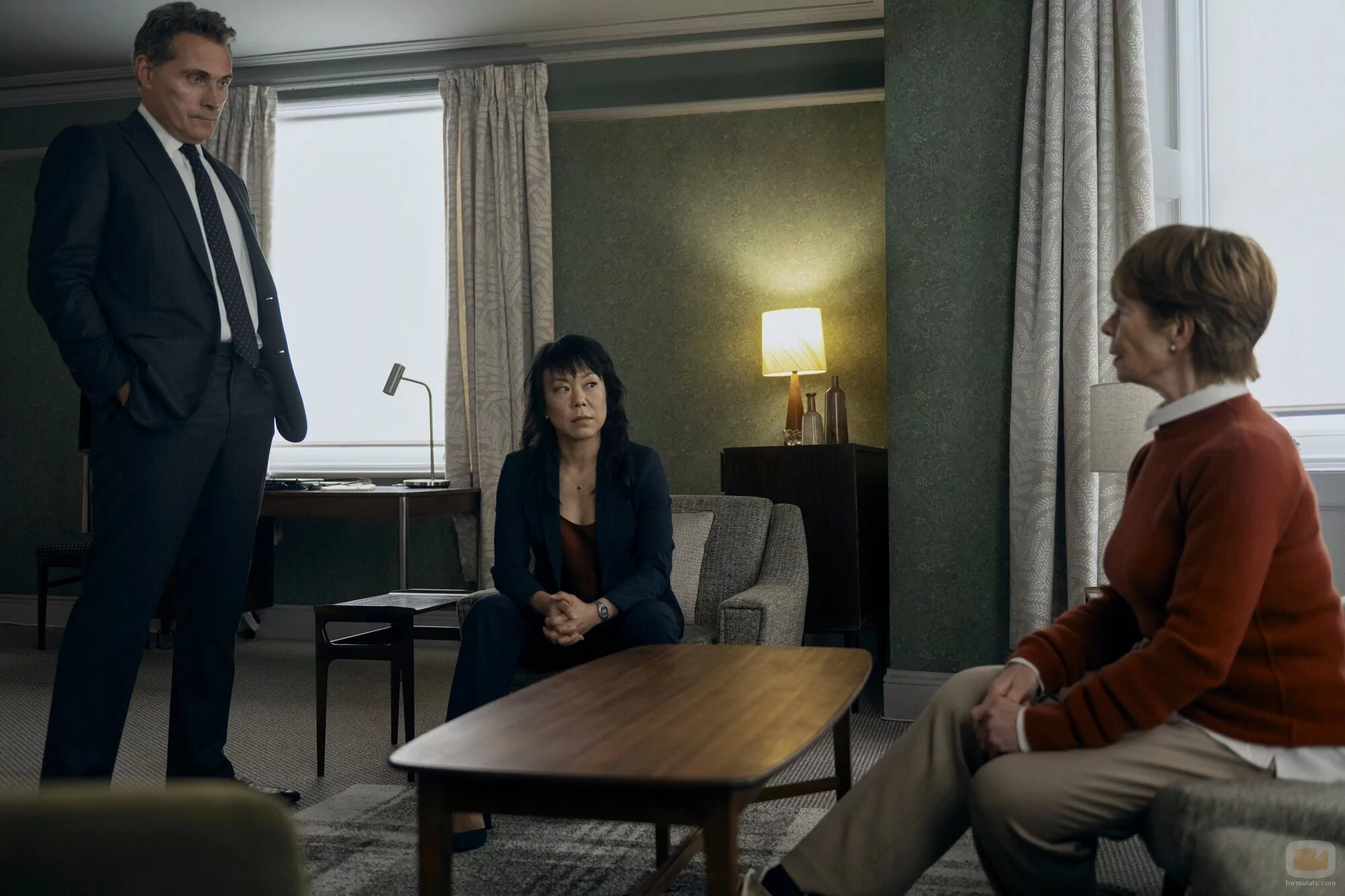 Rufus Sewell, Celia Imrie y Ali Ahn aparecen en una escena del episodio 3x01 de 'The Diplomat', la serie de televisión de Netflix.