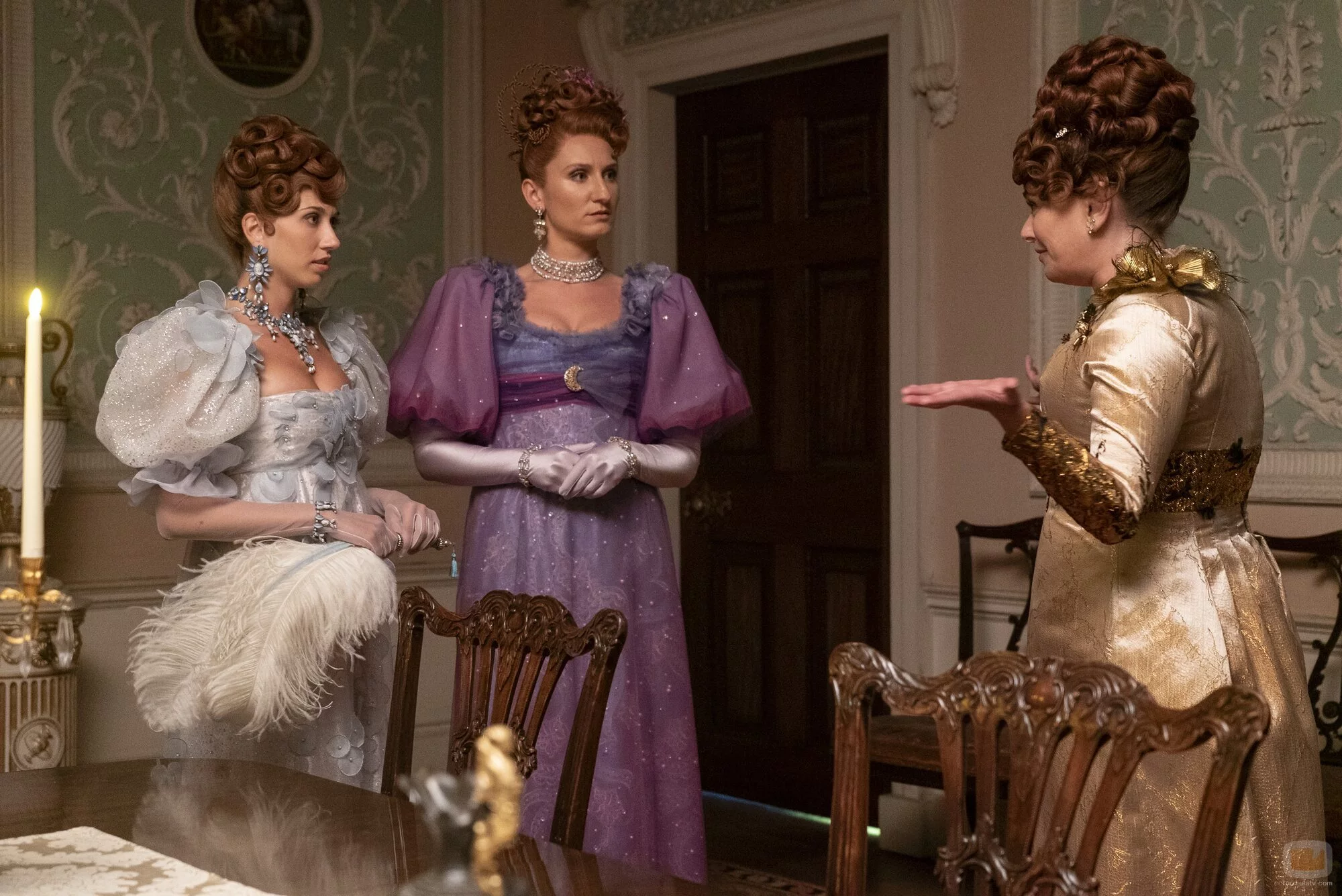 Harriet Cains, Bessie Carter y Polly Walker aparecen en una imagen promocional del episodio 3x02 de 'Los Bridgerton'.