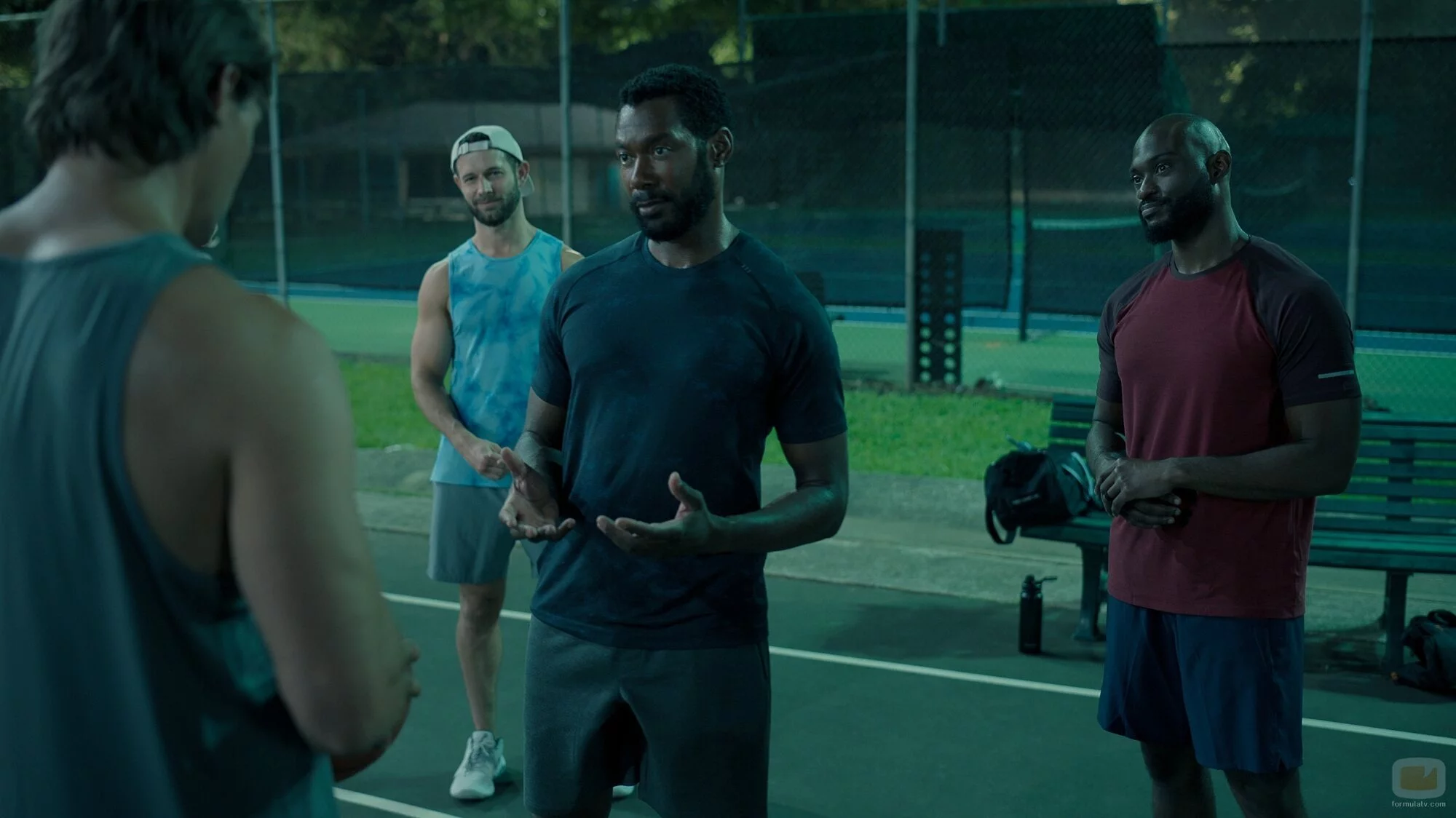 Justin Bruening, Frank Oakley III, Dion Johnstone y Hunter Burke aparecen en una escena promocional del episodio 'Un grado de compromiso' de 'Dulces Magnolias'.