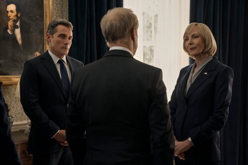 Allison Janney, Raphael Sbarge y Rufus Sewell aparecen en una foto del episodio 3x03 de 'La diplomática', la serie de televisión de Netflix.