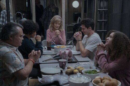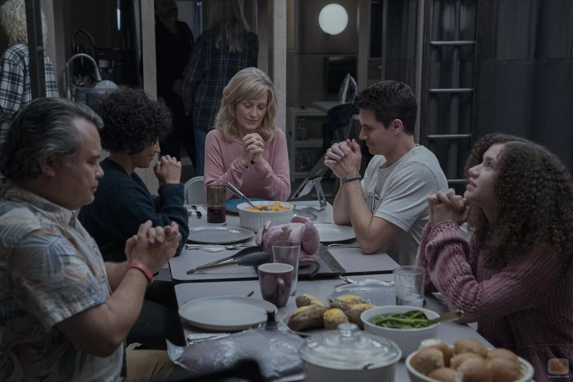 Robbie Amell, Jessica Tuck y Andy Allo aparecen en una foto del episodio 'El Día del Ciberdescuento' de la serie 'Upload'.