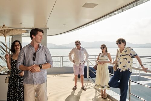 Patrick Schwarzenegger, Parker Posey, Jason Isaacs, Sam Nivola y Sarah Catherine Hook aparecen en una foto del episodio 'Te escondes o buscas' de la serie 'The White Lotus'.