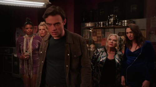 Paula Pell, Renée Elise Goldsberry, Sara Bareilles, Busy Philipps y Thomas Doherty aparecen en una foto del capítulo 'Cleveland' de la serie 'Girls 5 eva'.