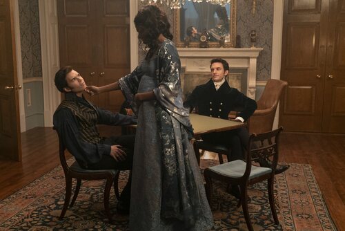 Simone Ashley, Luke Newton y Jonathan Bailey aparecen en una foto promocional del episodio 3x07 de la serie 'Bridgerton'.