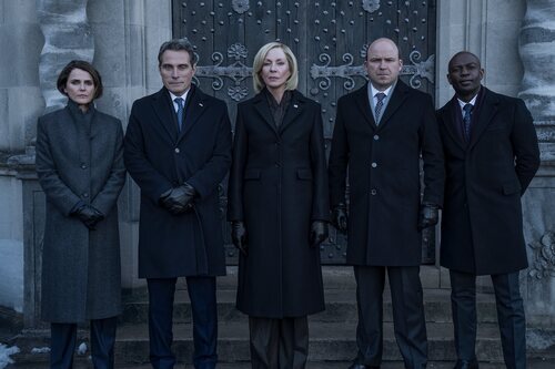 Rufus Sewell, David Gyasi, Keri Russell, Allison Janney y Rory Kinnear aparecen en una escena promocional del capítulo 3x08 de 'La diplomática'.