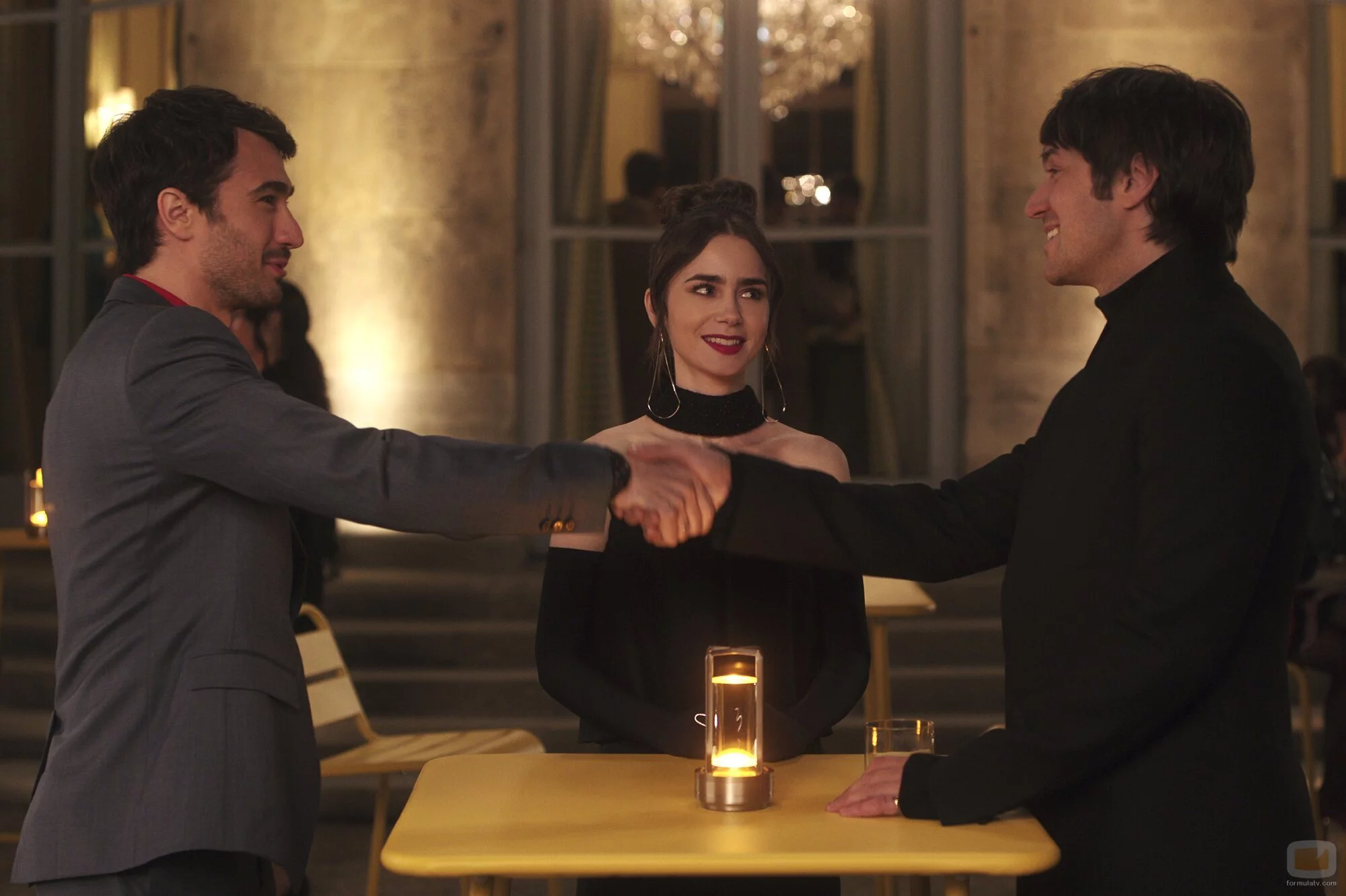 Lucas Bravo, Lily Collins y Eugenio Franceschini aparecen en una imagen del capítulo 'De vuelta a Le Crazy Horse' de la serie 'Emily in Paris'.