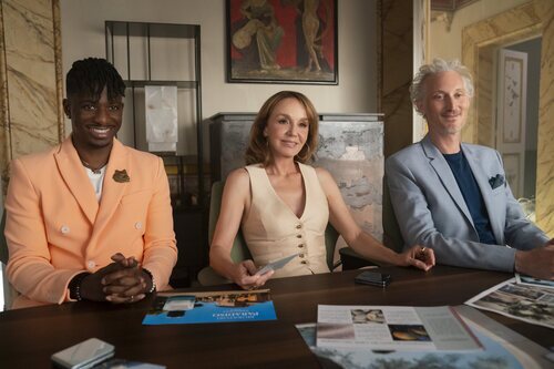 Philippine Leroy-Beaulieu, Samuel Arnold y Bruno Gouery aparecen en una foto promocional del capítulo 5x04 de 'Emily en París'.