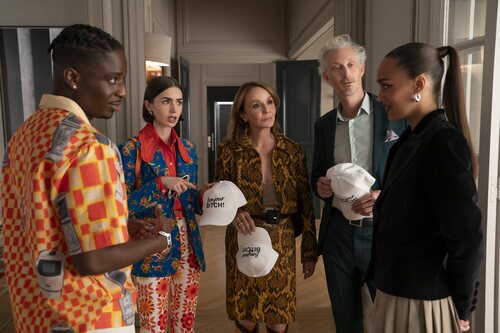 Lily Collins, Samuel Arnold, Bruno Gouery, Thalia Besson y Philippine Leroy-Beaulieu aparecen en una imagen del episodio 5x05 de 'Emily in Paris'.