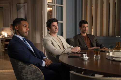 Paul Forman, Lucien Laviscount y Eugenio Franceschini aparecen en una escena del capítulo 5x08 de la serie 'Emily en París'.