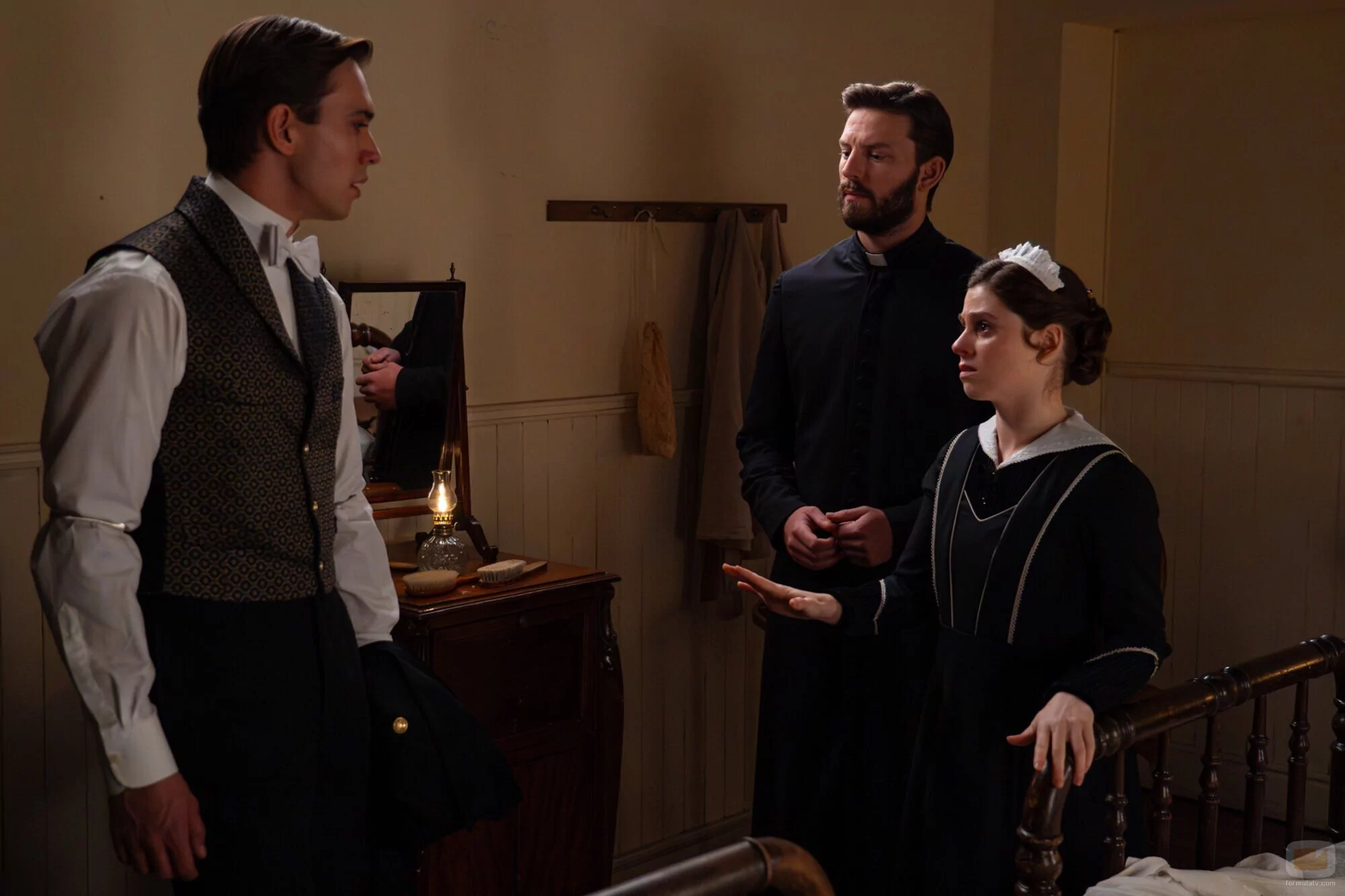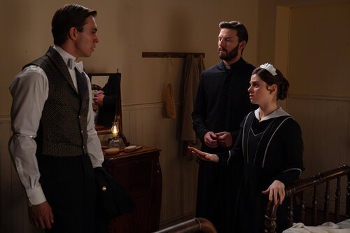 Sara Molina, Jose Miguel Blanco y Daniel Schröder aparecen en una foto promocional del episodio 'Martes 10 de marzo de 2026' de 'La Promesa'.