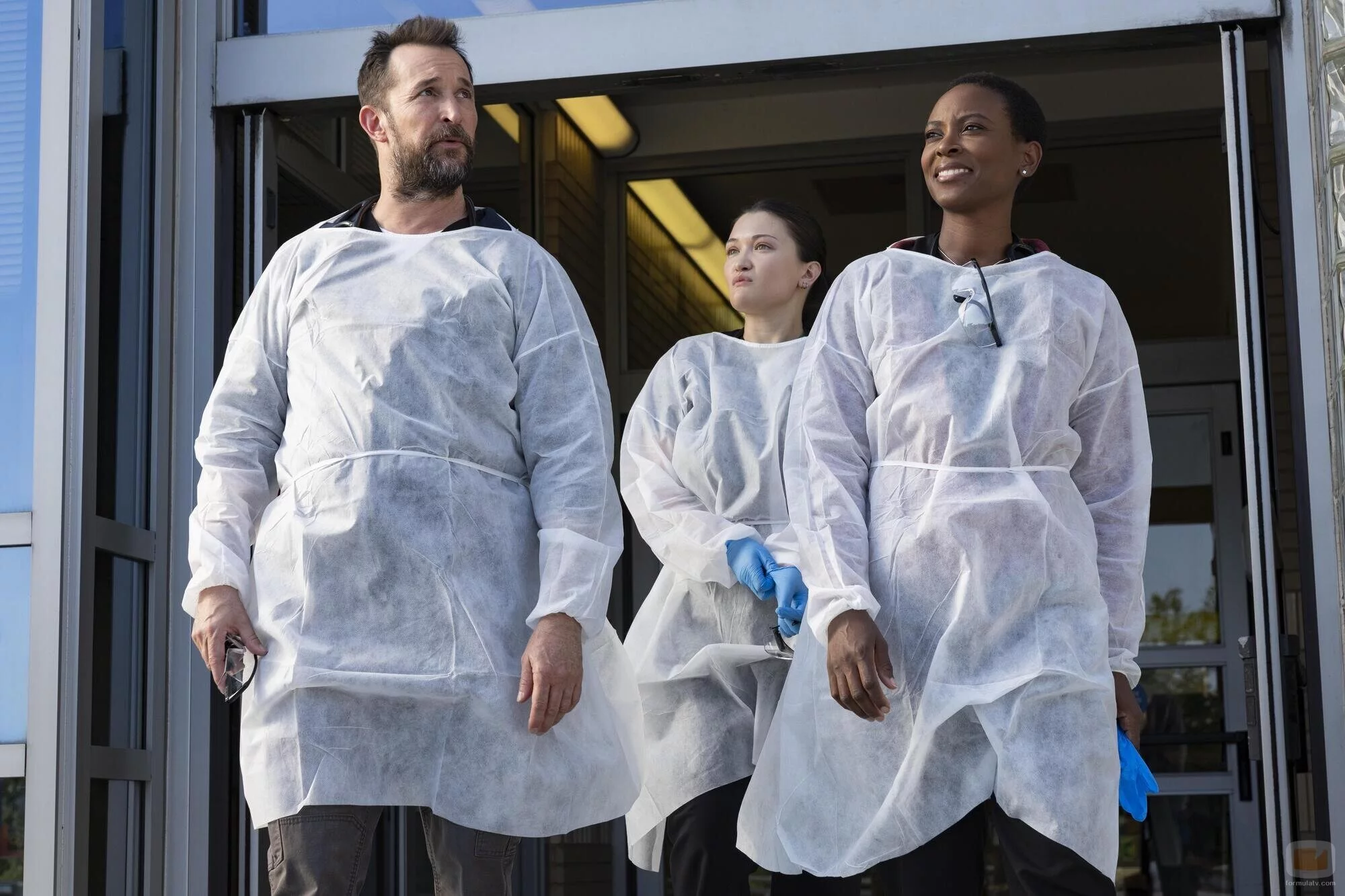 Isa Briones, Noah Wyle y Tracy Ifeachor aparecen en una foto promocional del capítulo '8:00 A.M.' de la serie 'The Pitt'.