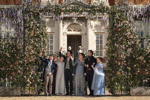 Florence Hunt, Luke Thompson, Will Tilston, Ruth Gemmell, Luke Newton y Nicola Coughlan aparecen en una escena promocional del capítulo 'A las claras' de 'Los Bridgerton'.