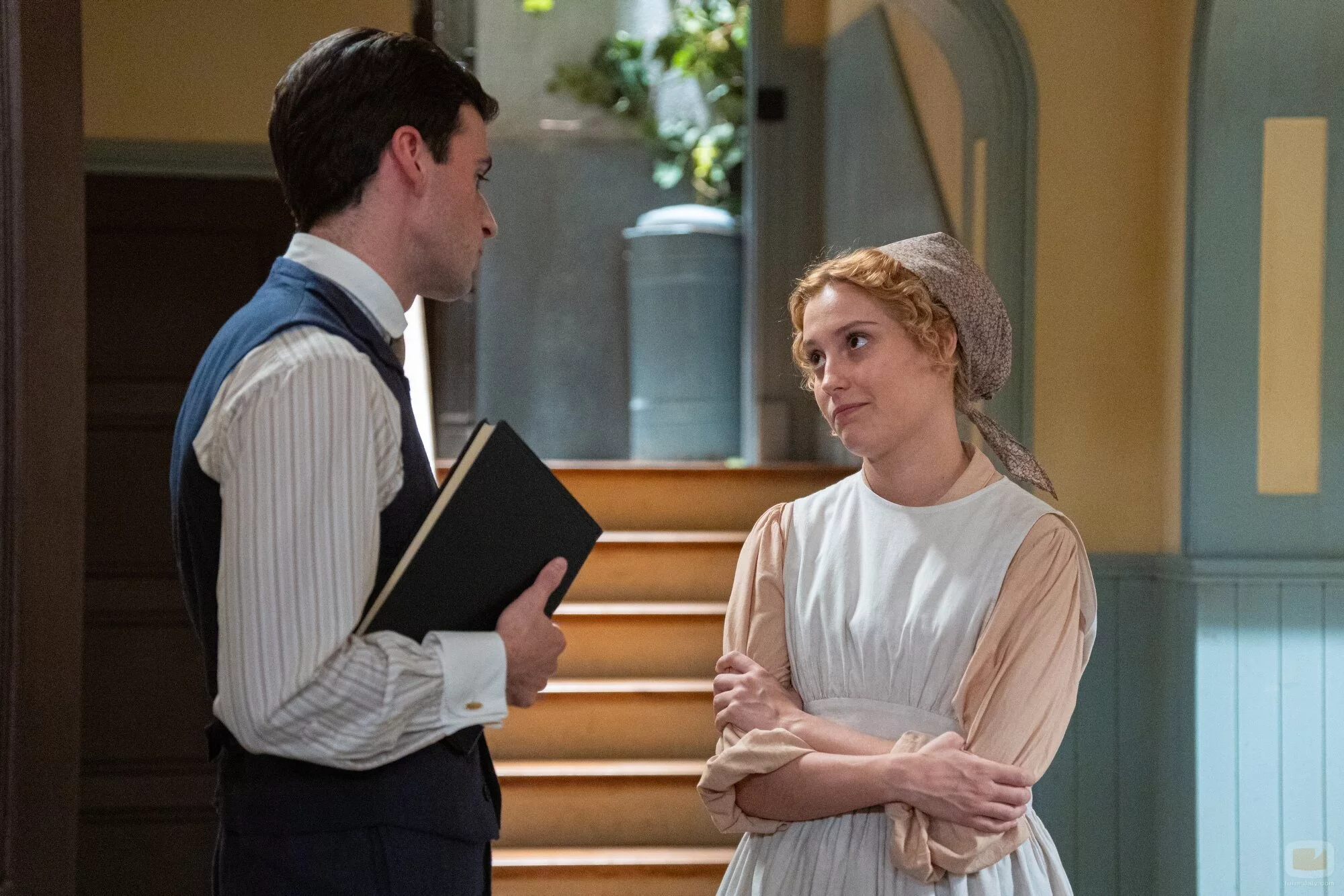 Jana Expósito con su ropa de criada observa a Abel Bueno, que lleva un libro en la mano, en la serie 'La promesa'.